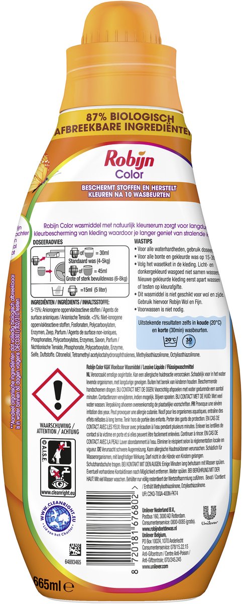 Robijn Klein & Krachtig Classics Color Vloeibaar Wasmiddel is speciaal ontwikkeld voor de gekleurde en bonte was. Dit dermatologisch goedgekeurde wasmiddel met natuurlijk kleurserum laat je was heerlijk ruiken en beschermt gekleurde kleding langdurig, waardoor je langer geniet van stralende kleuren. Het levert uitstekende resultaten, zelfs in koude (20 °C) en korte (30 minuten) wasbeurten, dankzij de verbeterde waskracht en vlekverwijdering. Deze wasmiddellijn van Robijn is ultrageconcentreerd. Met de vernieuwde formule hoef je slechts 30 ml in plaats van 35 ml te doseren voor een optimaal resultaat. Het wasmiddel is goed voor 22 wasbeurten, drie extra wasjes vergeleken met onze vorige formule van 2024. Dit wasmiddel bevat 87% biologisch afbreekbareIngrediënten*. Op deze manier draagt Robijn bij aan een duurzamere manier van wassen.